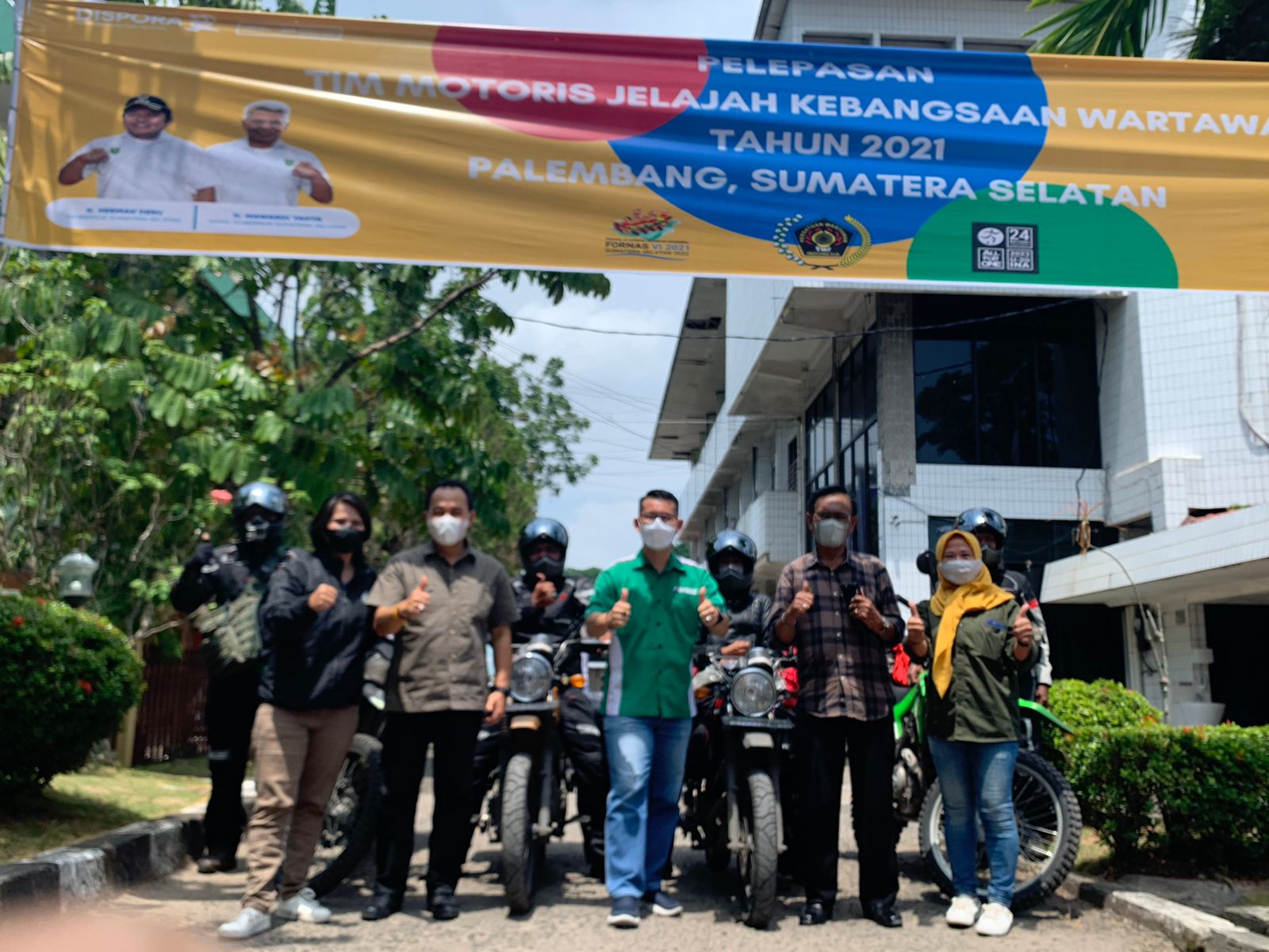 Kepala Dinas Pemuda dan Olahraga Provinsi Sumatra Selatan (Kadispora Sumsel), Ahmad Yusuf Wibowo melepas Tim Jelajah Kebangsaan Wartawan (JKW) PWI menuju Bangka Belitung.