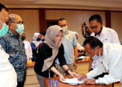 Penanda tangan kesepatan atau Memorendum of Understanding (MoU) yang dilakukan oleh Sekda Lahat Januarsyah SH MM, Sekda Muara Enim Ir Hasanudin MSi, Direktur utama PDAM Tirta Lematang Anda Wijaya S Kom dan Direktur PDAM Lematang Enim Sartono SH di Oproom Setda Lahat, Jum’at ( 10 /7/20).